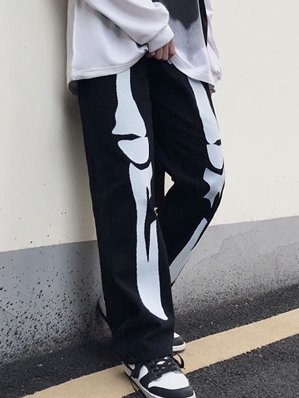 Estampado de esqueleto vanguardista: Los jeans están adornados con un estampado de esqueleto, agregando un elemento pop callejero y moderno al diseño. .